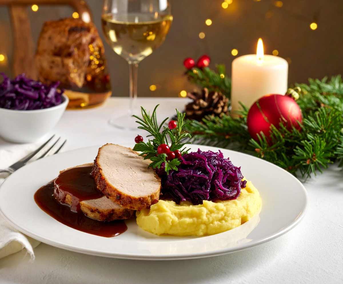 HAUPTGANG: Ayurvedischer Festbraten "Satva" mit Topinambur–Kartoffel-Stampf und Zimt-Rotkohl