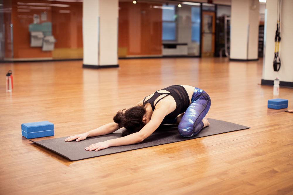 Die Stellung des Kindes ist eine erholsame Ruhepose, die nach jeder intensiven Übung eine willkommene Pause bietet. Du kniest dich hin, setzt dich auf die Fersen, streckst die Arme nach vorne und legst die Stirn sanft auf die Matte.