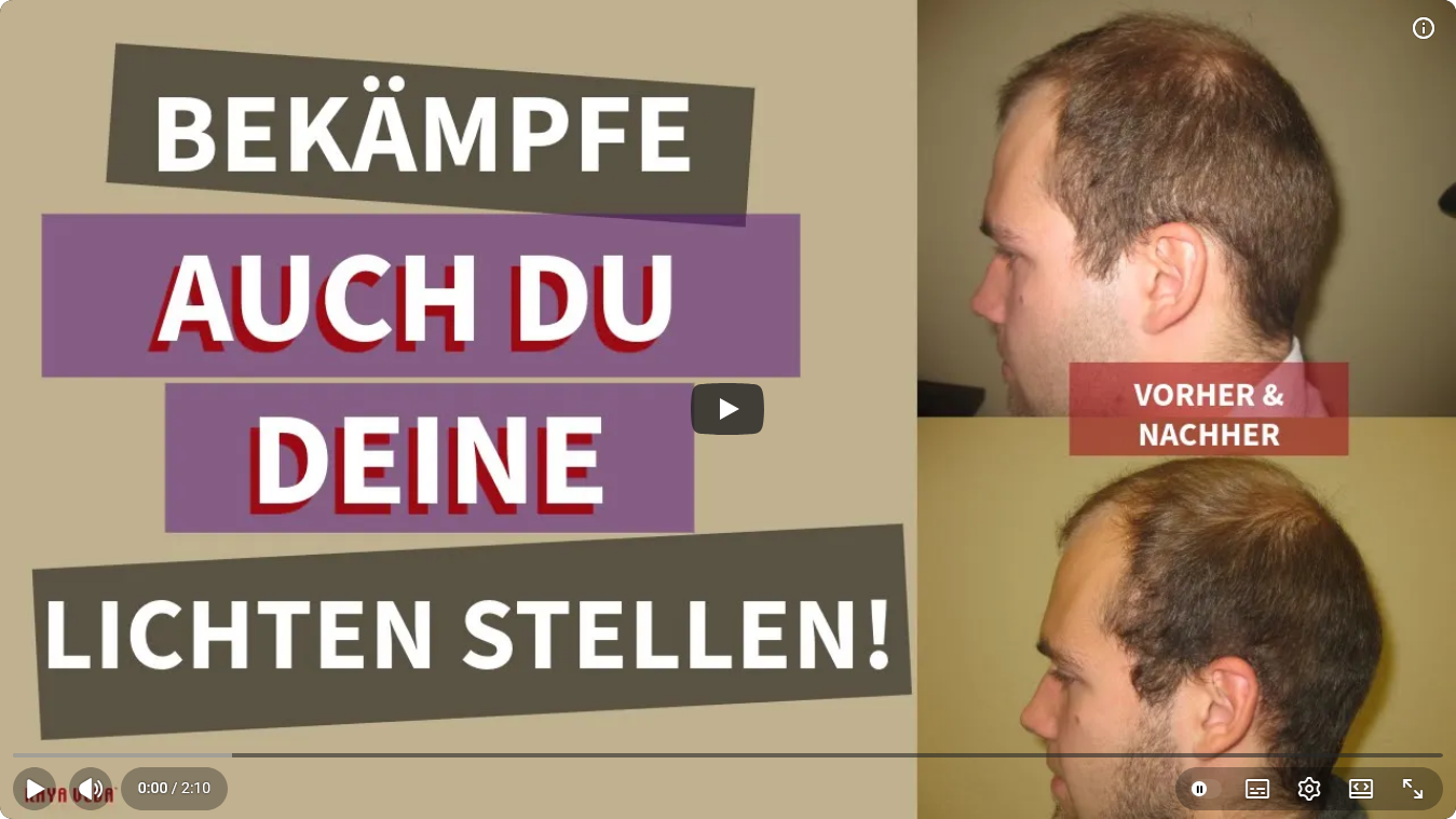 Viele Männer haben bereits positive Erfahrungen mit unserer Methode gemacht. In unserem Video berichtet ein Klient, wie die KAYA VEDA Methode seinen Haarausfall effektiv gestoppt hat. Vertrauen Sie unserer langjährigen Erfahrung in der ganzheitlichen Behandlung von Haarausfall, Geheimratsecken und Glatzenbildung. Zum Starten des Videos auf folgendes Bild klicken: