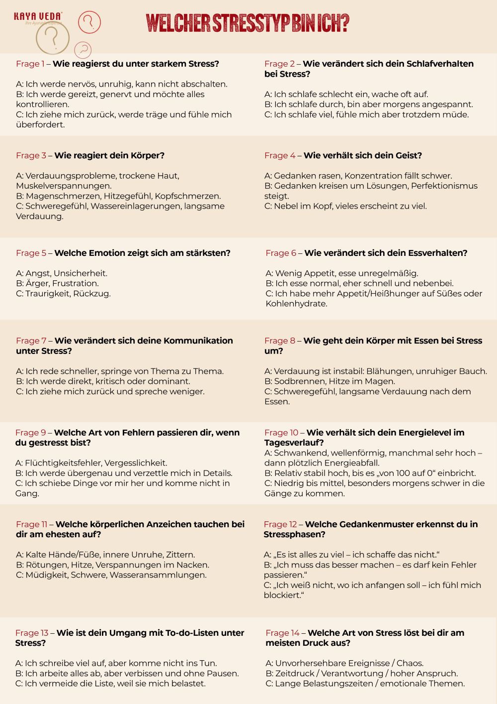 Stress zeigt sich bei jedem Menschen anders: Die einen werden unruhig und zerstreut, andere reagieren gereizt oder perfektionistisch, während wieder andere sich zurückziehen und antriebslos werden. Mit unserem kurzen Selbsttest kannst du herausfinden, welcher ayurvedische Stresstyp du bist und wie du deinen Stress auf natürliche und ganzheitliche Weise besser regulieren kannst.